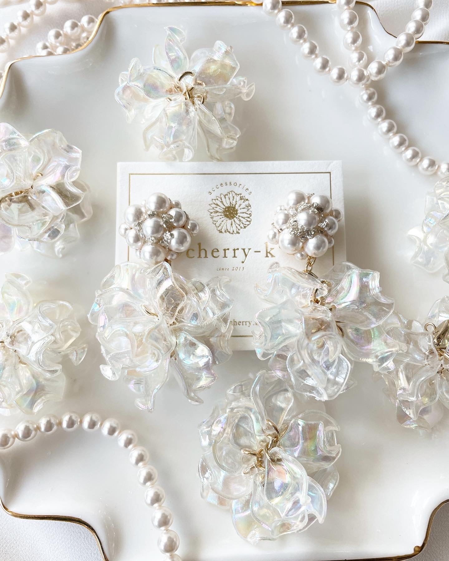 クリスタルスワロフスキーパール、チェコビーズ、シルバーフレークを使用した大人可愛いビジューに可愛いクリームホワイトの花びらタッセルをあわせました。