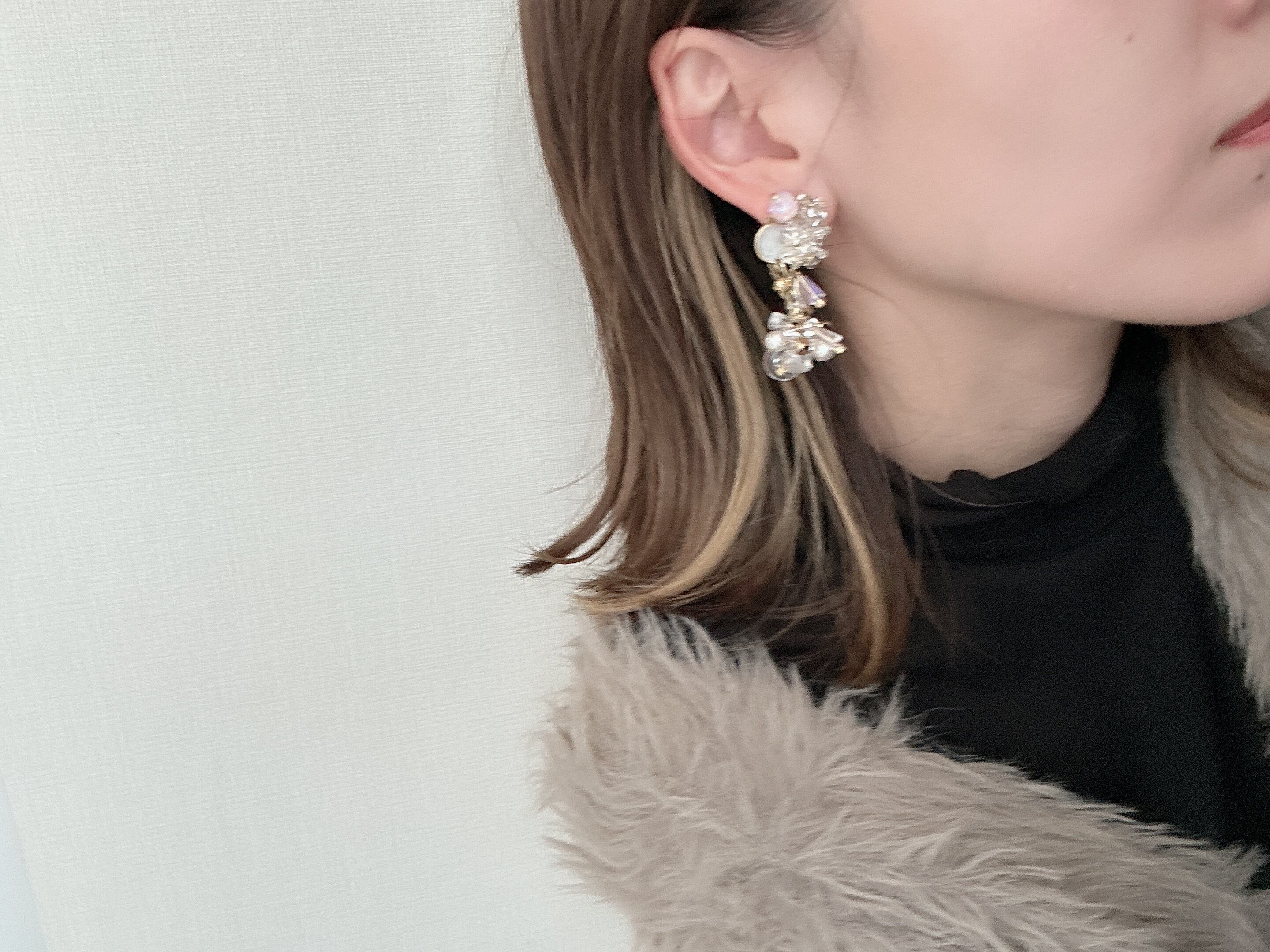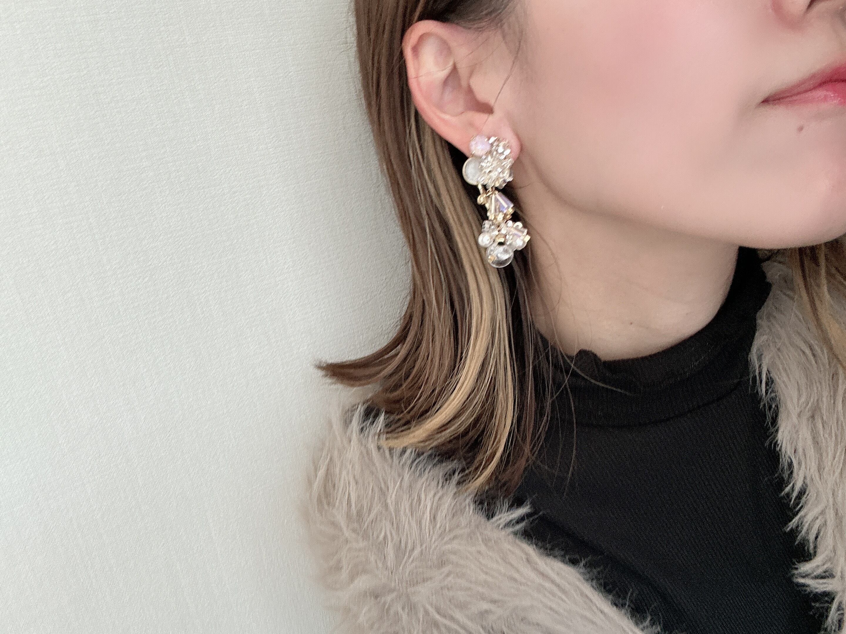 こちらは一つ一つ天然石やビーズを手編みしながら、ピンクベージュのスワロフスキーやレジンのなどで作り上げた存在感のあるトップのビジュー。