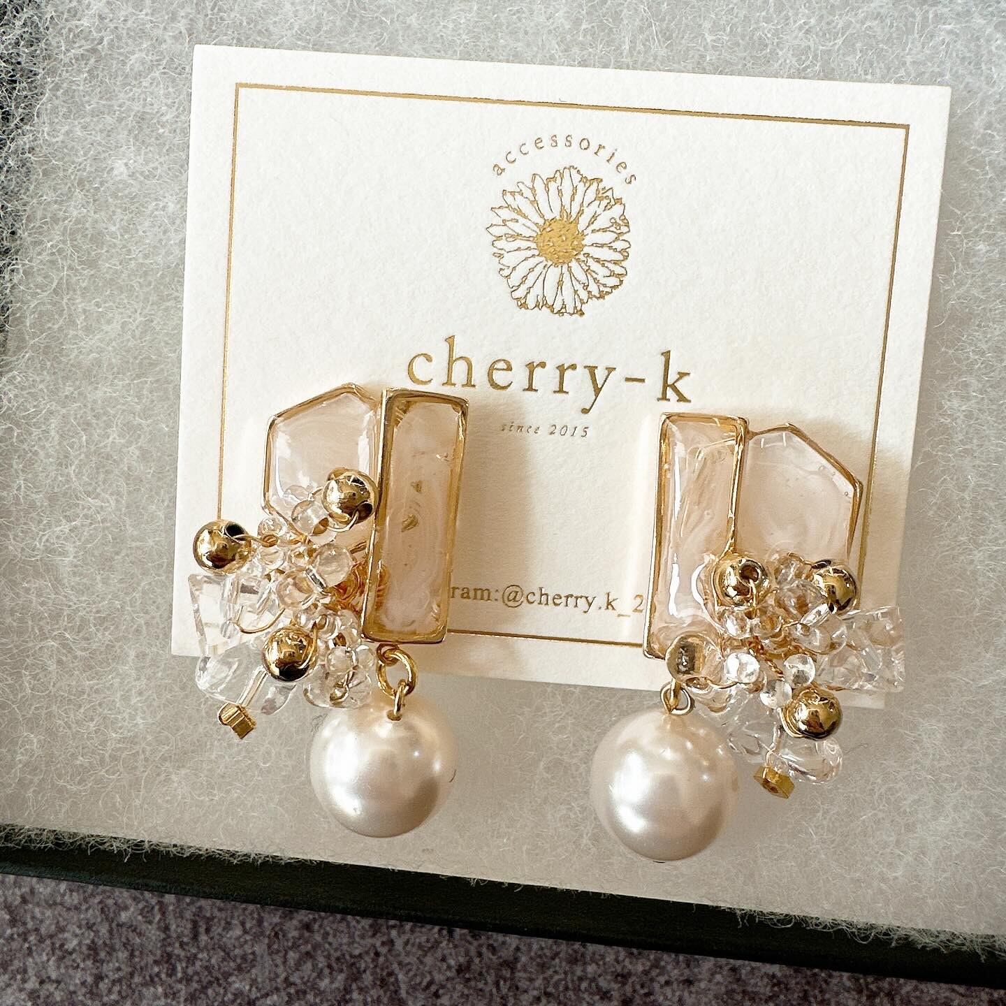 クリスタルの天然石をアクセントに使い、レジンやさまざまなビーズやパールを使ったビジューデザインに