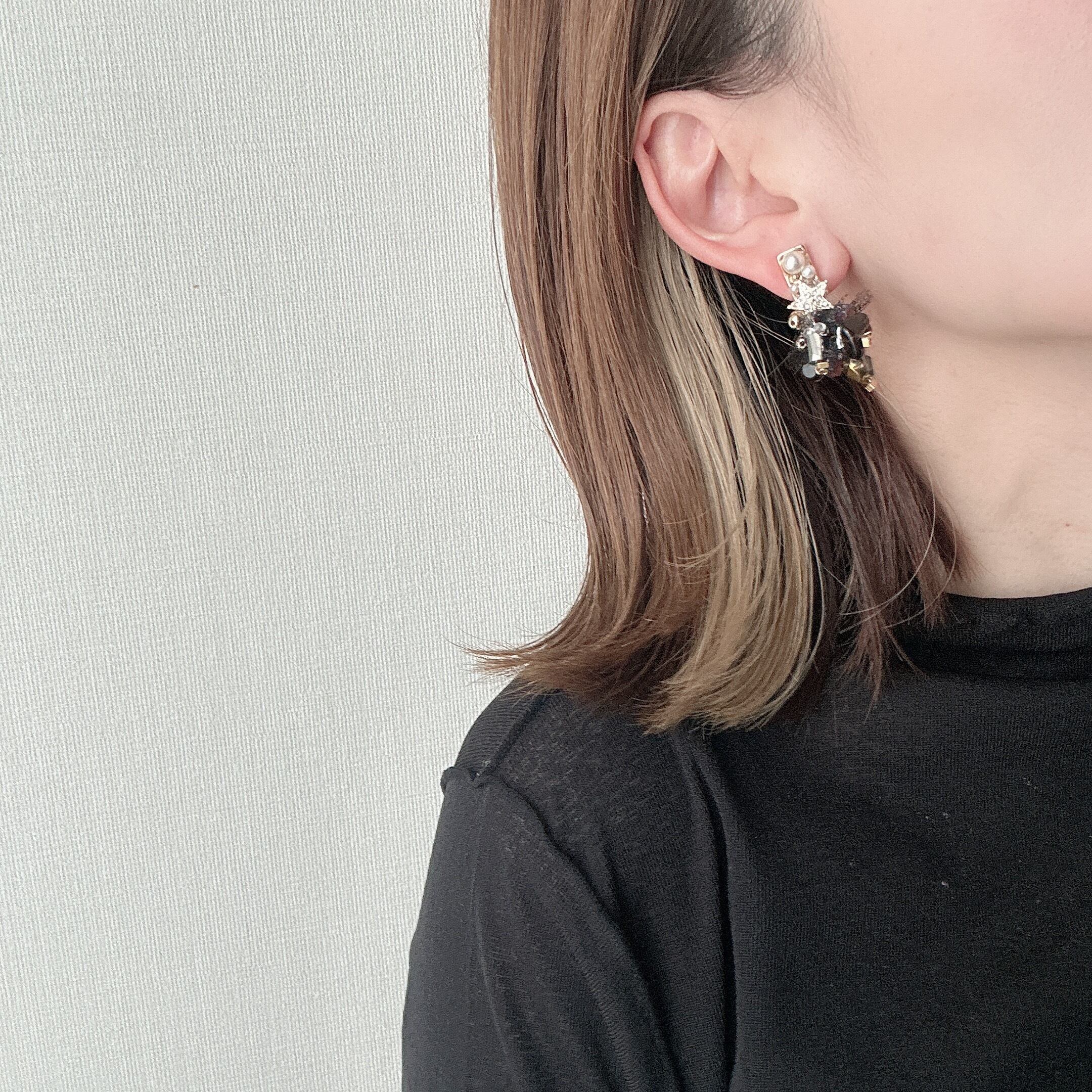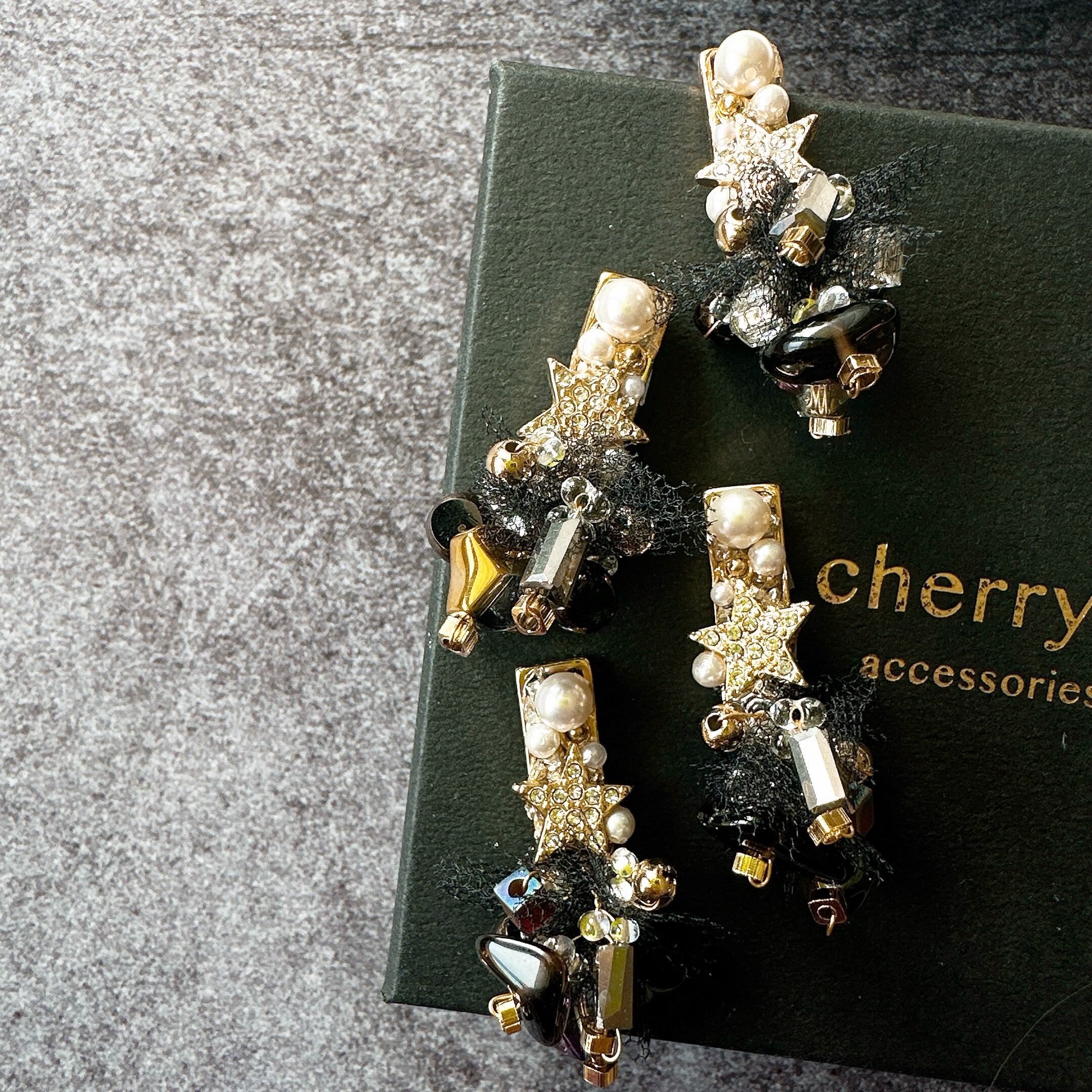 ブラックのチュール生地を天然石やチェコビーズ、ガラスビーズなどと一緒に編み込み、星チャームがアクセントになったcherry-kの中では小ぶりなデザイン。